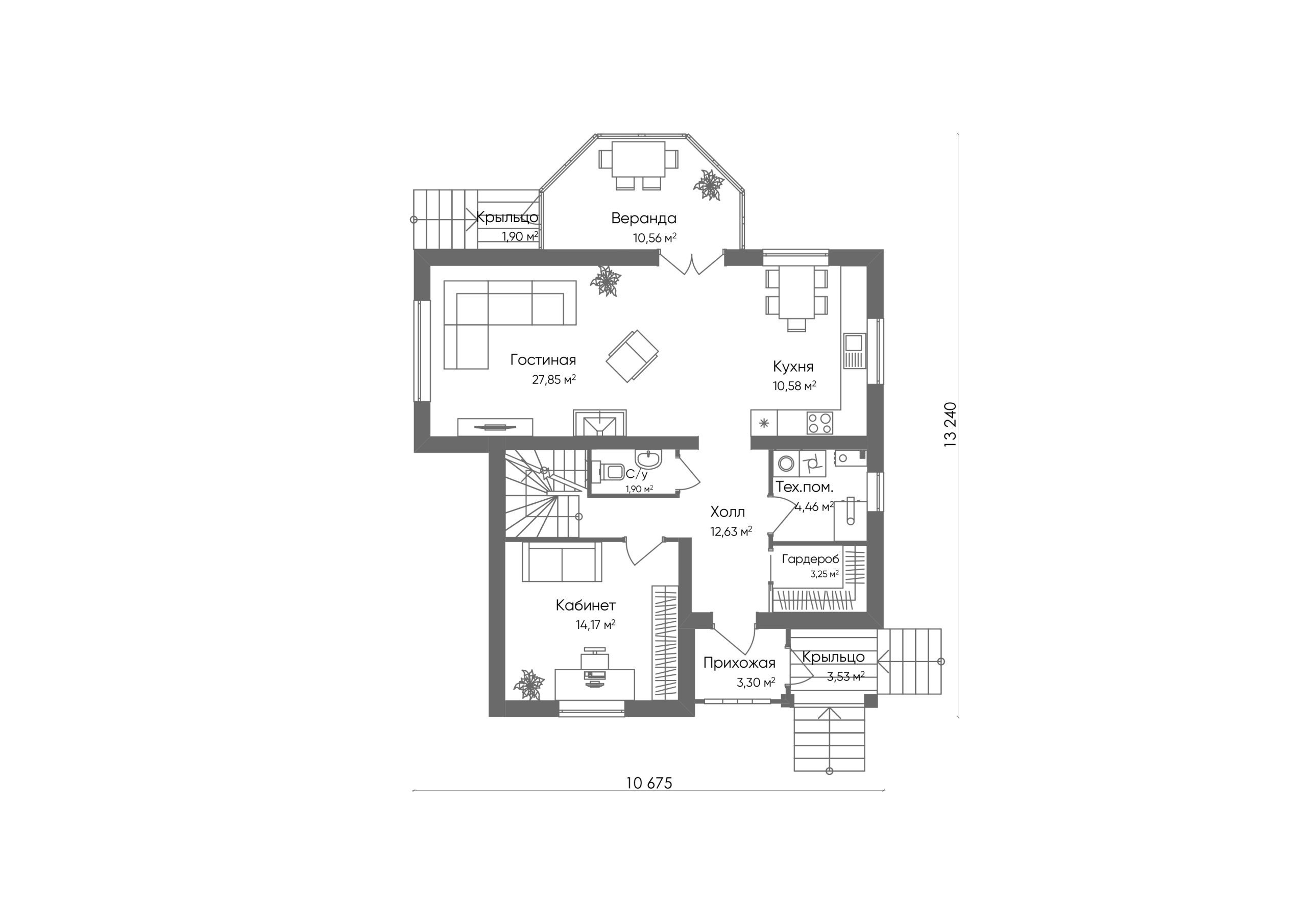 Кухня-гостиная 51,9 м² совмещена в единое функциональное пространство, которое станет центром притяжения всей семьи. А 3 спальни, кабинет и 2 санузла — это удобная и актуальная классика. В доме предусмотрена просторная веранда с возможностью выхода из кухни-гостиной. Есть все для того, чтобы наслаждаться спокойной загородной жизнью прямо в городе с городской пропиской