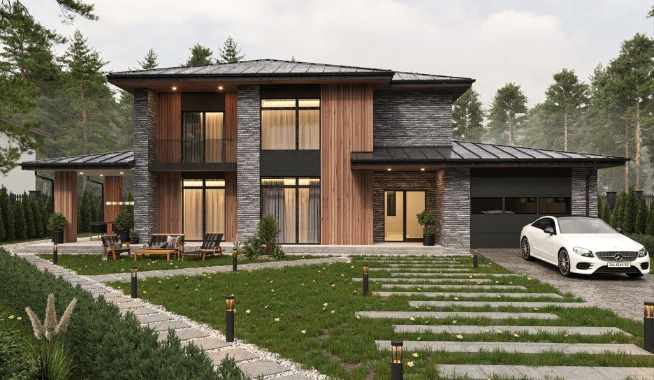 Эстетичный дом в классическом стиле с гаражом и просторной террасой в окружении великолепных ландшафтов Павловска