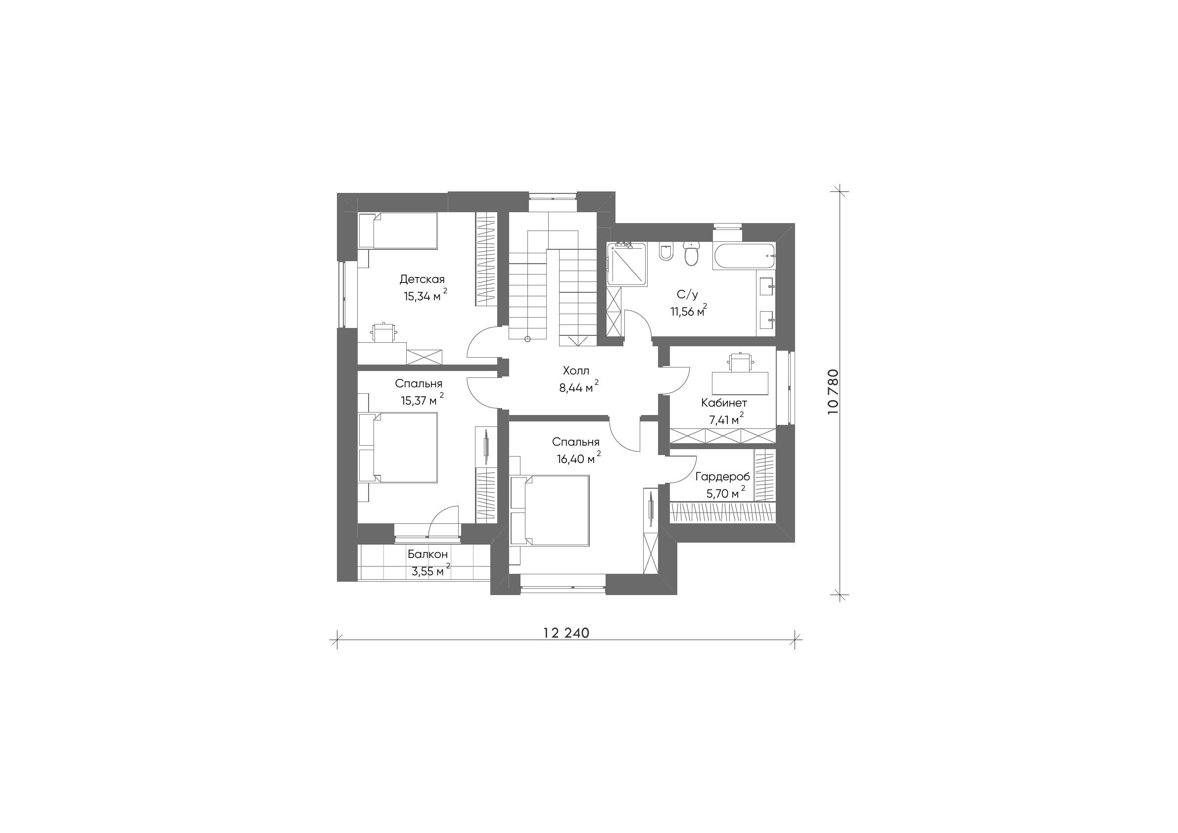 3 спальни 15,37 м², 15,34 м² и 16,40 м²